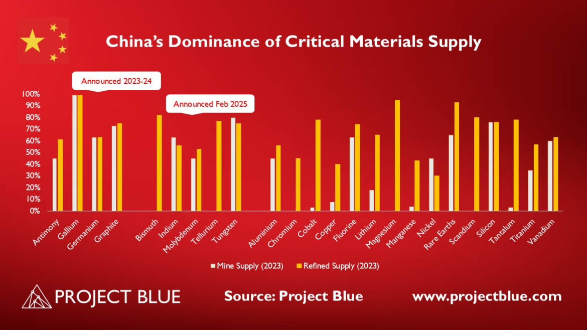 (Foto / Divulgação: Project Blue) O Ministério do Comércio da China (MOFCOM) anunciou novos embargos de exportação de cinco materiais críticos, uma medida incomum durante